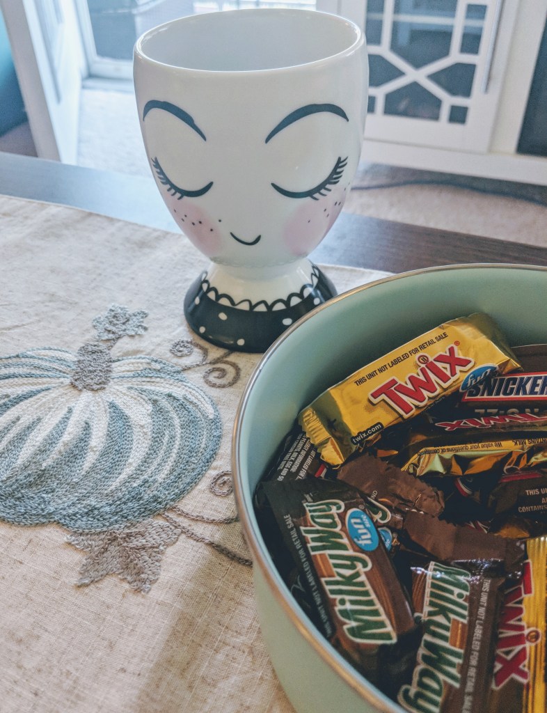 I have found that one of the things that my friends always comment on is my candy bowl. I ALWAYS have a candy bowl, but partnered with a cute fall table runner (from TJMAXX), my friends all say that it feels like home in the fall!