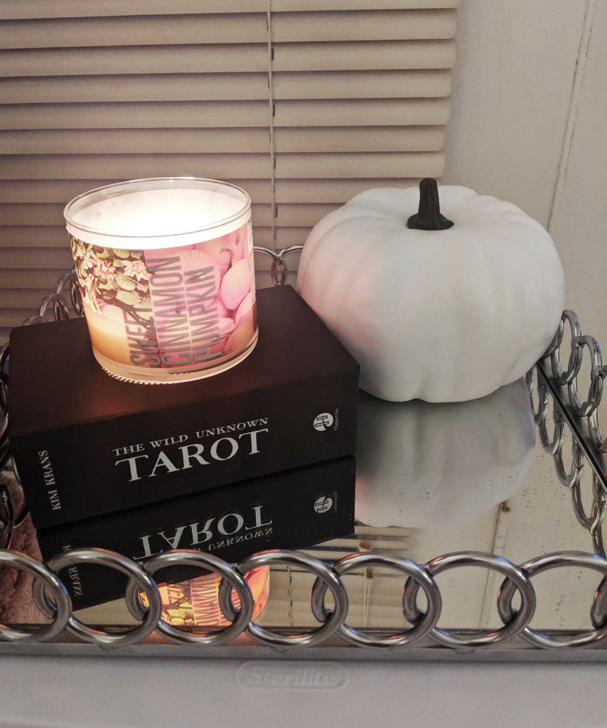 Another thing to remember is just the small accents! For this space you’re looking at, I wasn’t sure what I wanted to put on this tray. I typically have a candle there, so a fall scented candle was an obvious start. The next thing I chose was a white pumpkin. I personally love holiday decors in white because they go with everything else in your house! You won’t have to pay money each year as the rest of your home gets makeovers if your decor is universal! To finalize this, I needed to add a little bit of height to give something more aesthetically to look at. I personally own and use Tarot cards, and since it’s SPOOKY SEASON, I decided my deck would complete the look. You can pick this tarot set up on Amazon for $25 and it comes with a beginner guidebook!